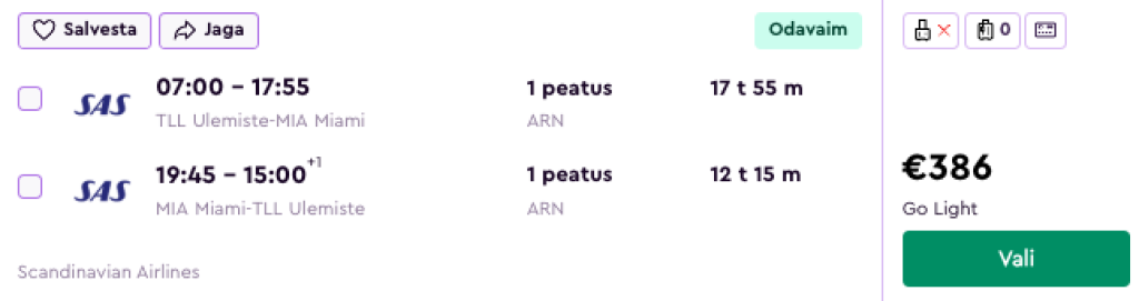 SAS pakub hetkel suurepärase hinnaga lennupileteid USAsse, Floridasse. Edasi-tagasi lennupiletid Tallinnast Miamisse on saadaval alates 386€ eest ning lendudel on olenevalt lennukuupäevadest ümberistumised Stockholmis või Kopenhaagenis.