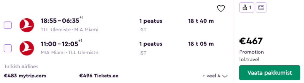 Turkish Airlines pakub hetkel suurepärase hinnaga lennupileteid Talllinnast Floridasse. Ühe kiire ümberistumisega edasi-tagasi lennupiletid Tallinnast Miamisse on saadaval alates 467€ eest ning lennupiletite hinna sees on nii äraantav pagas (2x23kg!) ja ka toitlustamine lennukite pardal. Soodsa hinnaga lennupileteid leiab külastamaks Floridat alates novembri algusest kuni 2024 aasta aprillini välja. Toome allpool välja vaid mõned näidiskuupäevad, saadavust leiab ka teisteks kuupäevadeks. Parima hinnaga lennupiletid leiad üles otsides läbi Momondo.ee.