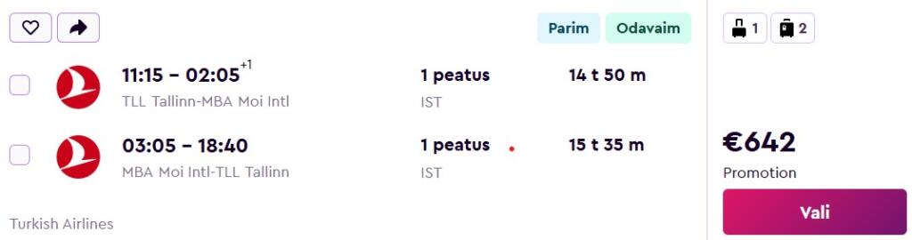 Turkish Airlines pakub lennupileteid Tallinnast India ookeani äärsesse Keeniasse. Ühe kiire ümberistumisega edasi-tagasi lennupiletid Tallinnast Mombasasse on saadaval alates 642€ eest.