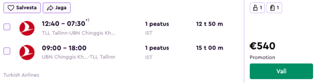 Turkish Airlines pakub hetkel soodsaid lennupileteid Mongooliasse. Ühe kiire ümberistumisega edasi-tagasi lennupiletid Tallinnast Ulaanbaatarisse on saadaval alates 540€ eest.