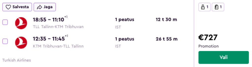 Turkish Airlines pakub hetkel hea hinnaga lennupileteid Nepaali. Edasi-tagasi lennupiletid Tallinnast Katmandusse on saadaval alates 727€ eest. Miinuseks on tulenevalt lennuplaanist tagasiteel pikem ümberistumine Istanbulis, mille puhul saab üldjuhul Turkish Airlinesi poolt tasuta öömaja.