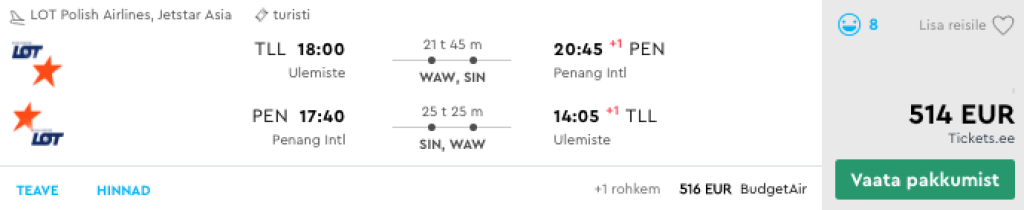 LOT koostöös Jetstariga pakuvad hetkel väga hea hinnaga lennupileteid Malaisiasse Penangi saarele. Edasi-tagasi lennupiletid Tallinnast Penangi on saadaval alates 514€ eest. Lendudel on mõlemal suunal 2 ümberistumist, Varssavis ning Singapuris. Lennupiletite hinna sees on nii äraantav pagas kui toitlustamine LOTi pardal. Hea hinnaga lennupileteid leiab augusti lõpust kuni 2020 aasta märtsi lõpuni välja. Soodsate lennupiletiteni jõudmiseks kliki allolevatel lennukuupäevadel või kontrolli endale sobivaid läbi Momondo.ee