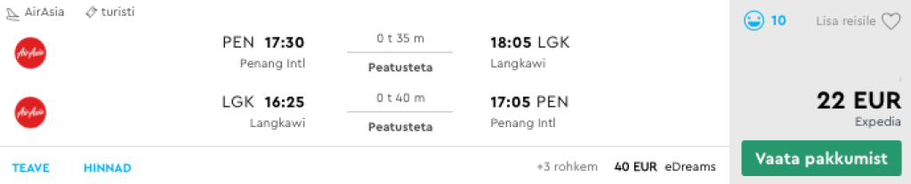 ####IDEE - Külasta ühel reisil nii Penangi kui Langkawi saartPenangi ja Langkawi vahel lendavad mitmeid kordi päevas odavlennufirmad Firefly kui AirAsia. Soodsaimad edasi-tagasi lennupiletid leiab üles vaid kuskil 20€ eest ning AirAsia soodusmüükide ajal võib piletid isegi 10€ eest saada. Otsi endale sobivad lennupiletid üles läbi Momondo.ee