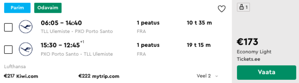 Lufthansa pakub hetkel suurepärase hinnaga lennupileteid Tallinnast Madeira saarest kirdes asuvale liivarandadega Porto Santo saarele. Ühe ümberistumisega edasi-tagasi lennupiletid on saadaval alates 173€ eest ning soodsa hinnaga lennupileteid leiab alates juuli keskpaigast kuni oktoobrini. Miinuseks on tagasiteel tulenevalt lennuplaanist pikem ümberistumine Frankfurdis (tuleb veeta öö). Otsisime välja ka hea hinna ja kvaliteedisuhtega hotellipakkumise Frankfurdi lennujaama läheduses. Parima hinnaga lennupiletid leiab üles läbi Momondo.ee.