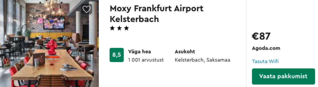 Kuna tagasiteel tuleb tulenevalt lennuplaanist veeta Frankfurdis öö, otsisime välja ka soodsa hinnaga hotellipakkumise otse Frankfurdi lennujaamas.