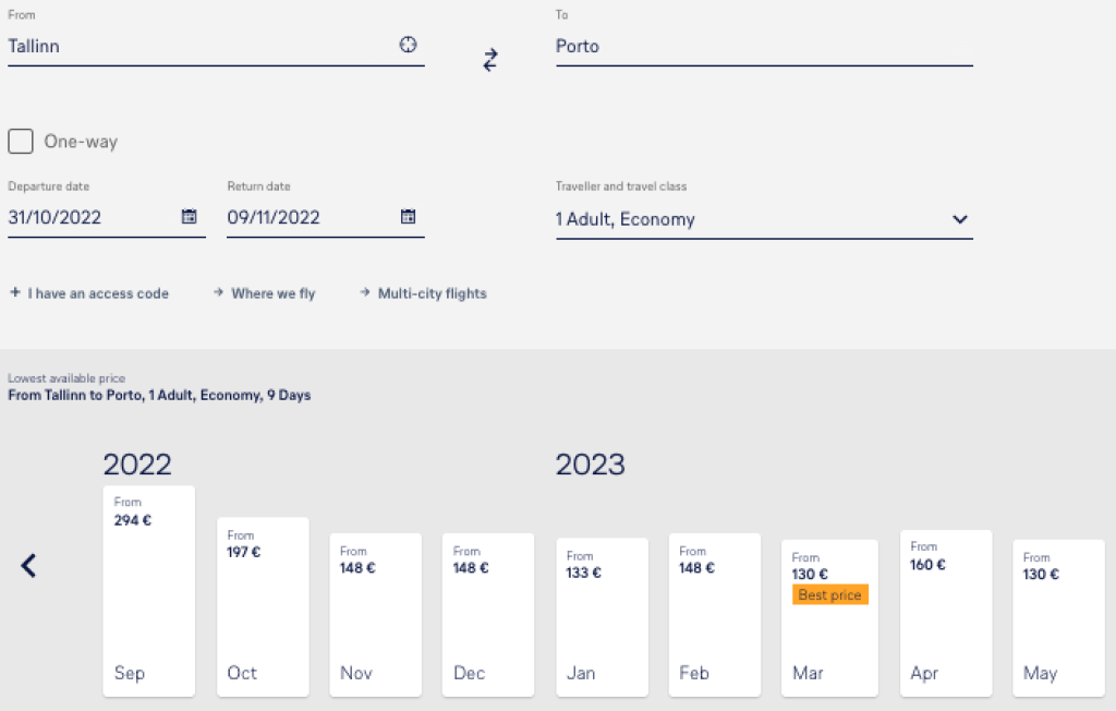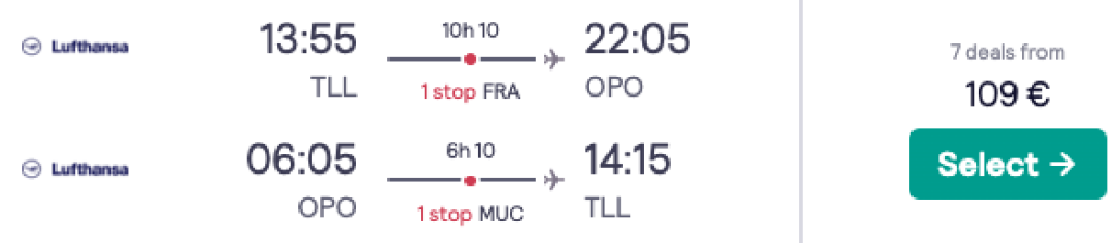 Lufthansa koostöös SWISSiga pakuvad hetkel suurepärase hinnaga lennupileteid Portosse. Edasi-tagasi lennupiletid Tallinnast on saadaval alates 109€ eest ning hea hinnaga lennupileteid leiab alates oktoobri lõpust kuni 2023 aasta suveni välja. Lennud on mõlemal suunal ühe ümberistumisega Frankfurdis, Zürichis või Münchenis. Parima hinnaga lennupiletid leiad üles läbi Skyscanneri, aga meie soovitus on minna Lufthansa.com ja ja soetada lennupiletid otse lennufirmalt kuskil kümne euro võrra kallimalt.