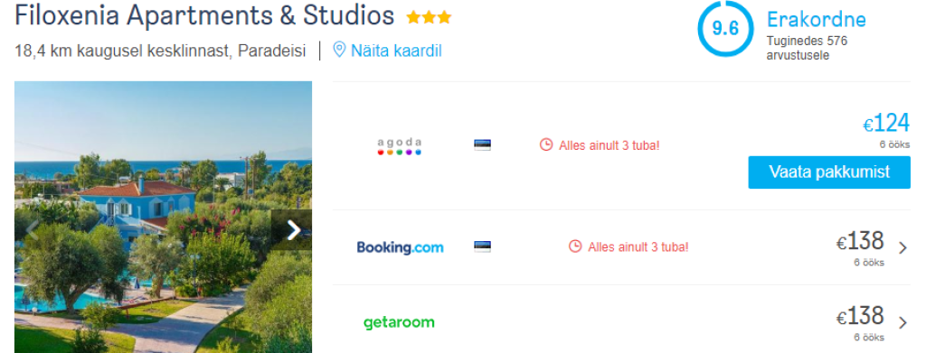 Toome välja ka näidispakkumise veetmaks nädalane puhkus Rhodose saarel vahemikus 18.05-24.06. Pakkumise soetamiseks tuleb eraldi soetada nii lennupiletid Tallinnast Rhodosele kui ka hotellipakkumine.Lennupiletid hinnaga 163€ leiad siit