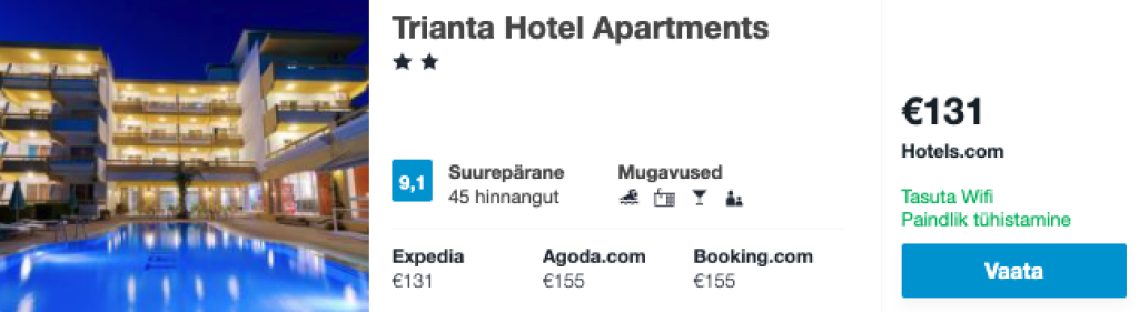 Toome välja ka näidispakkumise veetmaks nädalane puhkus Rhodose saarel vahemikus 22.05-28.05. Pakkumise soetamiseks tuleb eraldi soetada nii lennupiletid Tallinnast Rhodosele kui ka hotellipakkumine.Lennupiletid hinnaga 159€ leiad siit