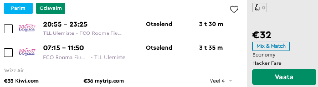 Odavlennufirma Wizz Air pakub hetkel väga hea hinnaga lennupileteid Itaalia pealinna Rooma. Edasi-tagasi lennupiletid Tallinnast Rooma (Fiumicino lennujaama) on hetkel saadaval alates 32€ eest ning hea hinnaga lennupileteid leiab jaanuarist kuni märtsini. Ühe suuna piletihind on alates 16€. Lennud Tallinna ja Rooma vahel toimuvad kuni 22.03 kolmapäeviti ja reedeti ning alates märtsi lõpust kuni suveni välja esmaspäeviti ja reedeti (hea võimalus pikaks nädalavahetuseks). Piletiteni jõudmiseks kliki allpool olevatel näidiskuupäevadel või kontrolli endale sobivaid lennukuupäevi läbi Momondo.ee