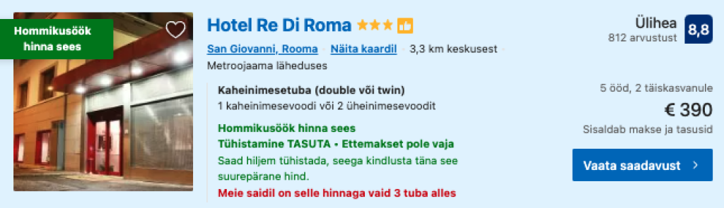 Kui otsid soodsa hinnaga majutust Roomas või mujal Itaalias, siis soovitame parima ülevaate ja hinna saamiseks kasutada hotellihindade võrdlusportaali Booking.com
