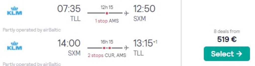 KLM/AF pakuvad hetkel väga hea hinnaga lennupileteid Kariibidele. Edasi-tagasi lennupiletid Tallinnast Saint Martinile on saadaval alates 514€ eest ning saadavus on septembrist detsembrini. Lendudel on mõlemal suunal üks või kaks ümberistumist. Soodsate lennupiletiteni jõudmiseks kliki allolevatel näidiskuupäevadel või sisesta endale sobivad lennukuupäevad Skyscannerisse. Kui soovid osta piletid otse lennufirmalt, siis sisesta soovitud lennukuupäevad KLM'i kodulehele.