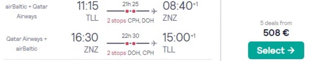 Qatar Airways pakub hetkel väga hea hinnaga lennupileteid sügiseks ja talveks Sansibarile. Edasi-tagasi lennupiletid Tallinnast on saadaval alates 508€ eest ning saadavus on suurepärane septembrist kuni märtsini 2022. Parima hinnaga lennupiletid leiad üles läbi Skyscanneri. Kui soovid osta lennupiletid otse lennufirmalt, siis sisesta alltoodud lennukuupäevad otse Qatar Airwaysi kodulehele (hinnad al 557€).