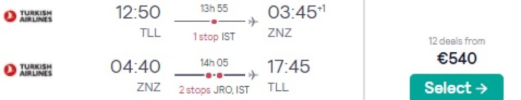 Hetkel leiad väga hea hinnaga lennupileteid Turkish Airlinesiga Tallinnast Sansibarile. Edasi-tagasi lennupiletid on saadaval alates 540€ eest ning hea hinnaga lennupiletite saadavus on suurepärane novembrist kuni märtsini välja. Piletiteni jõudmiseks kliki allpool olevatel näidiskuupäevadel või kontrolli endale sobivaid lennukuupäevi läbi Skyscanneri