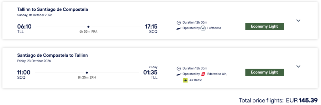 Lufthansa koostöös SWISSiga pakuvad hetkel väga hea hinnaga lennupileteid Põhja-Hispaanias asuvasse Santiago de Compostelasse. Soodsaimad ühe ümberistumisega lennupiletid Tallinnast on saadaval alates 145€ eest.