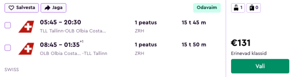 Lufthansa koostöös SWISSiga pakuvad hetkel suurepärase hinnaga lennupileteid Sardiinia saarele. Edasi-tagasi lennupiletid Tallinnast Olbiasse on saadaval alates 131€ eest. Miinuseks on tihtipeale tulenevalt lennuplaanist päevasel ajal pikem ümberistumine kas siis Zürichis või Frankfurdis, mis annab ka võimaluse emb-kumma linnaga tutvumiseks.