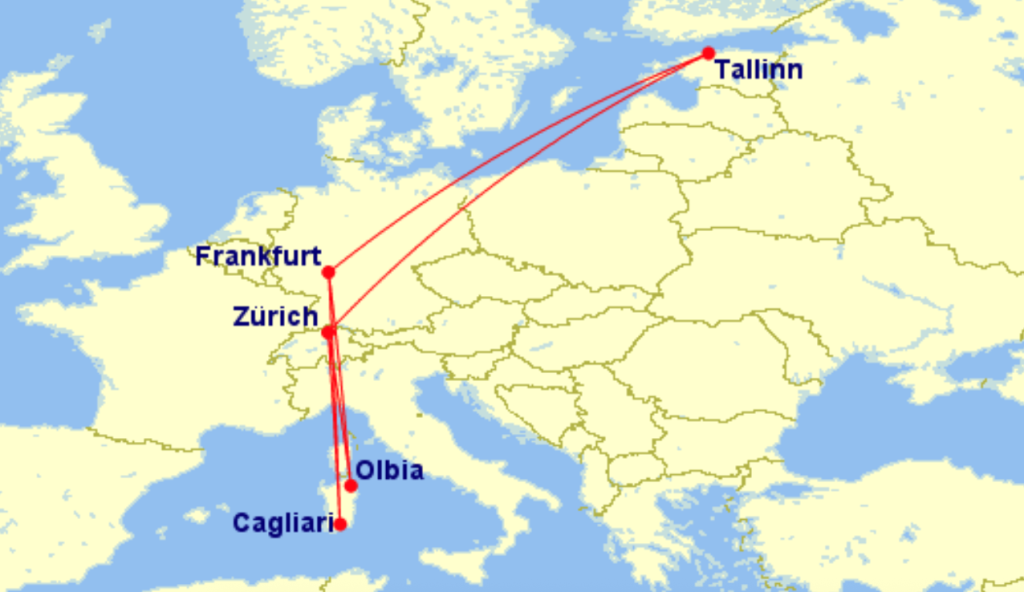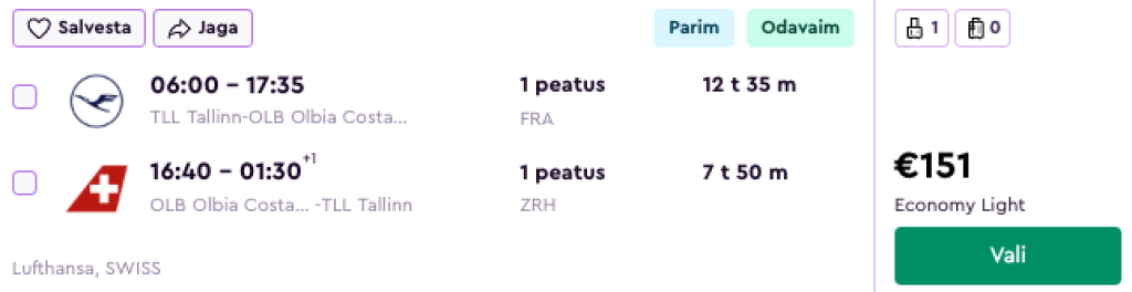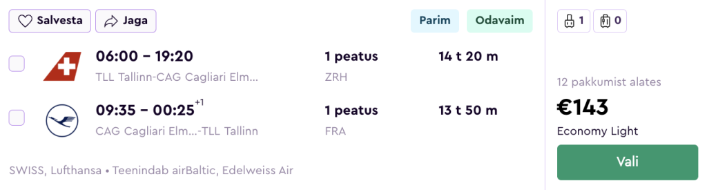 Lufthansa koostöös SWISSiga pakuvad hetkel suurepärase hinnaga lennupileteid Sardiinia saarele. Edasi-tagasi lennupiletid Tallinnast Cagliarisse on saadaval alates 143€ ning Olbiasse alates 151€ eest. Miinuseks on osadel kuupäevadel pikemad ümberistumised päevasel ajal kas siis Frankfurdis või Zürichis, aga tihtipeale leiab ka kiirete ümberistumistega lende mis on vaid mõnevõrra kallimad.