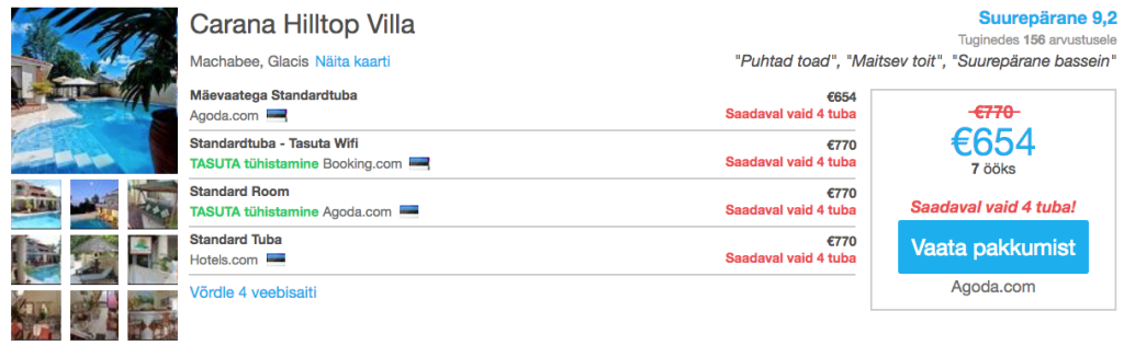 ####Hotellipakkumised SeišellidelSeišellidel leidub öömaja ka hinnatundlikutele inimestele. Ehkki hinnad on kõrgemad kui Aasias võib leida HotelsCombined.ee lehelt majutust Seišellidel ka hinnaga 30-40€ öö/per person.Meie soovitus:Carana Hilltop Villa - Väga hea reitinguga tuba kahele maksab nädalaks ajaks 654€. Hotellil on olemas bassein ning tubadel ka oma terrass/rõdu. Vaata pakkumist siit