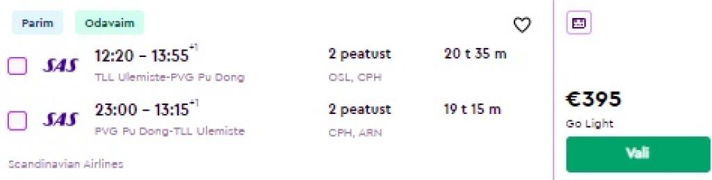 SAS pakub hetkel suurepärase hinnaga lennupileteid Hiinasse. Edasi-tagasi lennupiletid Tallinnast Shanghaisse on saadaval alates 395€ eest. Saadaval on hea valik soodsaid lennukuupäevi!