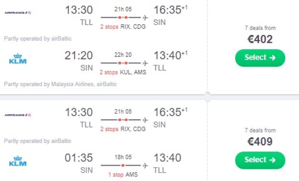 Air France ja KLM pakuvad hetkel väga hea hinnaga lennupileteid Tallinnast Singapuri. Edasi-tagasi lennupiletid on saadaval alates 402€ eest ning hea hinnaga lennupileteid leiab oktoobrist märtsini. Parima hinnaga lennupiletid leiad üles läbi skyscanneri.