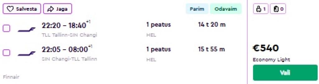 Finnair pakub hetkel kampaaniahinnaga lennupileteid Singapuri. Edasi-tagasi lennupiletid Tallinnast on saadaval alates 540€ eest.