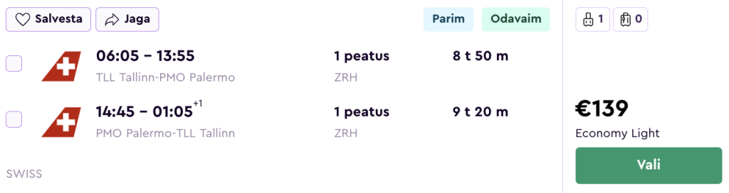 SWISS koostöös Lufthansaga pakuvad hetkel väga hea hinnaga lennupileteid Sitsiiliasse. Lennupiletid Tallinnast Palermosse on saadaval alates 139€ eest.