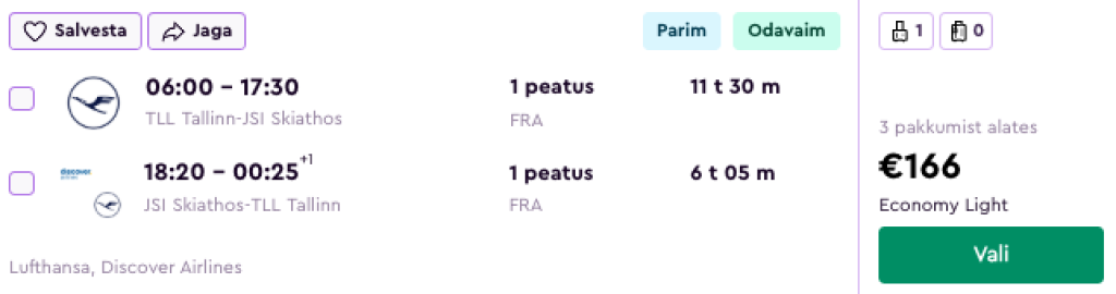 Lufthansa ja SWISS pakuvad hetkel väga hea hinnaga lennupileteid Skiathose saarele Kreekas. Soodsaimad edasi-tagasi lennupiletid Tallinnast on saadaval vaid 166€ eest ning lennud on ümberistumistega Zürichis või Frankfurdis.