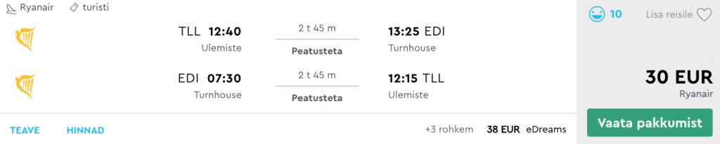 Ryanair pakub hetkel hea hinnaga lennupileteid Tallinnast Šotimaale. Edasi-tagasi lennupiletid Tallinnast Edinburghi leiab üles alates 30€ eest. Soodsaim hind on kahenädalaseks Šotimaa avastamiseks aga hea hinnaga lennupileteid leiab ka lühemateks reisideks. Soodsa hinnaga lennupiletite saadavust leiab septembris-oktoobris. Lennud Tallinna ja Edinburghi vahel toimuvad 2x nädalas kolmapäeviti ja pühapäeviti. Piletiteni jõudmiseks kliki allolevatel näidiskuupäevadel või otsi endale sobivad lennupiletid üles läbi Momondo.ee