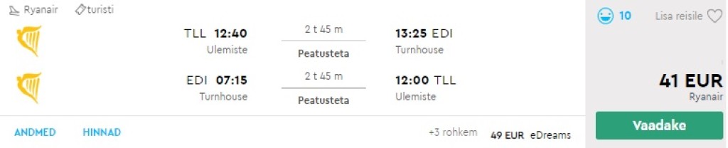 Odavlennufirma Ryanair pakub hetkel väga hea hinnaga lennupileteid Tallinnast Šotimaale. Edasi-tagasi lennupiletid Tallinnast Edinburghi leiab üles alates 41€ eest. Hea hinnaga lennupiletid on saadaval külastamaks Šotimaad aprillis-mais. Piletiteni jõudmiseks kliki allolevatel näidiskuupäevadel.