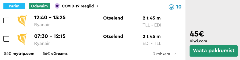Ryanair pakub hetkel väga hea hinnaga lennupileteid Tallinnast Šotimaale. Edasi-tagasi lennupiletid Tallinnast Edinburghi leiab üles alates 45€ eest ning hea hinnaga lennupiletite saadavust leiab septembrist kuni kuni 2021 aasta jaanuarini peaaegu et kõikidele lendudele. Lennud Tallinna ja Edinburghi vahel toimuvad kuni oktoobri lõpuni 2x nädalas kolmapäeviti ja pühapäeviti ning alates oktoobri lõpust esmaspäeviti ja reedeti. Suurepärase hinnaga lennupiletid leiab ka veetmaks pikk nädalavahetus Edinburghis (K-P või R-E) . Piletiteni jõudmiseks kliki allolevatel näidiskuupäevadel või otsi endale sobivad lennupiletid üles läbi Momondo.ee