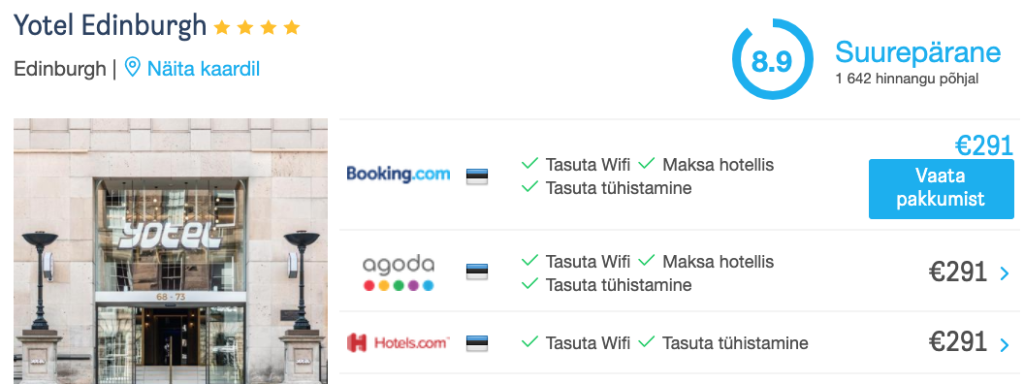 Toome välja ka näidispakkumise veetmaks Edinburghis pikk nädalavahetus (K-P). Valisime näidiskuupäevadeks 09.09-13.09 (4ööd). Sarnase hinnaga hotellipakkumisi leiab ka teisteks kuupäevadeks.