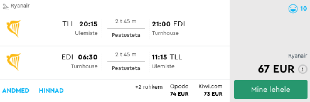 Iiri odavlennufirma Ryanair taaskäivitab alates 29.10 lennud Tallinnast Šotimaale ning hetkel on soodsaimad edasi-tagasi lennupiletid Tallinnast Edinburgh'i saadaval alates 67€ eest. Alla 100€ lennupileteid leidub oktoobri lõpust kuni detsembrini. Lennud toimuvad 2x nädalas, esmaspäeviti ja reedeti, mis tähendab, et on võimalik teha ka soodne linnatripp Edinburghi veetmaks seal nädalavahetus (R-E). Parima hinnaga lennupiletid leiad hõlpsasti üles läbi Momondo.ee