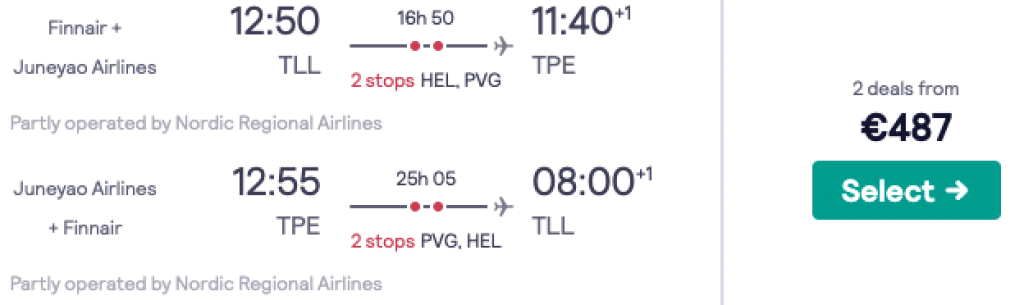 Juneyao Airlines ja Finnair pakuvad hetkel väga hea hinnaga lennupileteid Tallinnast Taiwani. Edasi-tagasi lennupiletid Tallinnast Taipeisse on saadaval 487€ eest ning saadavust leidub üksikutel kuupäevadel veebruaris-märtsis. Lennupiletite hinna sees on nii toitlustamine lennufirmade pardal kui äraantav pagas. Tagasiteel on päevasel ajal pikem ümberistumine Shanghais, mis annab ka võimaluse Shanghaiga tutvumiseks(Shanghai on transiidi puhul eestlastele 144h viisavaba). Piletiteni jõudmiseks kliki allolevatel näidiskuupäevadel või kontrolli endale sobivaid kuupäevi läbi Skyscanneri