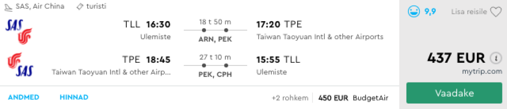 Star Alliance lennufirmad SAS ja Air China pakuvad hetkel väga hea hinnaga lennupileteid sügisel ja talvel Tallinnast Taiwani. Soodsaimad edasi-tagasi lennupileteid Tallinnast Taiwani pealinna Taipeisse on saadaval alates 437€ eest. Miinuseks on enamjaolt tagasiteel päevasel ajal 7h ümberistumine Kopenhaagenis ja vahel ka minnes sarnane ümberistumine Stockholmis. Saadavust leiab alates novembri keskpaigast kuni aprilli alguseni ning samuti ka mais. Parima hinnaga lennupiletid leiad üles allpool olevate otselinkide kaudu või otsides lennupiletid üles läbi Momondo.eeTaiwan on troopilise kliimaga riik Kagu-Aasias, kus ka jaanuaris ning veebruaris võivad päevased õhutemperatuurid kerkida üle 25 kraadi.