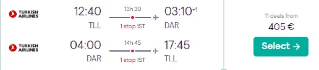 Turkish Airlines pakub hetkel soodsa hinnaga lennupileteid Tansaaniasse. Edasi-tagasi lennupiletid Tallinnast Dar es Salaami on saadaval alates 405€ eest ning hea hinnaga lennupiletite saadavust leiab kogu sügiseks ja talveks. Piletite hinnas sisaldub ka äraantav pagas! Piletiteni jõudmiseks kliki allpool välja toodud näidiskuupäevadel või kontrolli endale sobivaid lennukuupäevi läbi Skyscanneri.