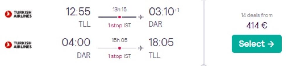 Turkish Airlines pakub hetkel soodsa hinnaga lennupileteid Tansaaniasse. Edasi-tagasi lennupiletid Tallinnast Dar es Salaami on saadaval alates 414€ eest ning hea hinnaga lennupileteid leiab detsembrist märtsini (sh ka jõuludeks). Piletite hinnas sisaldub ka äraantav pagas! Piletiteni jõudmiseks kliki allpool välja toodud näidiskuupäevadel või kontrolli endale sobivaid lennukuupäevi läbi Skyscanneri.