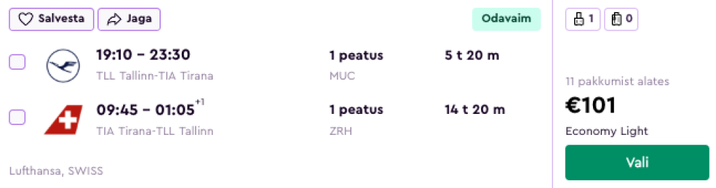 Lufthansa koostöös SWISS'i ja Austrianiga pakuvad hetkel suurepärase hinnaga lennupileteid Albaaniasse. Edasi-tagasi lennupiletid Tallinnast Albaania pealinna Tiranasse on saadaval alates 101€ eest. Miinuseks on osadel kuupäevadel soodsaima hinna puhul päevasel ajal pikem ümberistumine (kuskil 8-9h) Zürichis või Münchenis, mis annab ka võimaluse emb-kumma linnaga tutvumiseks.