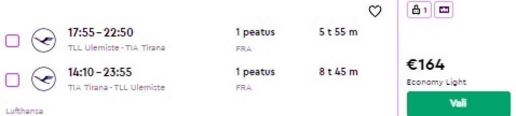 Erinevad Star Alliance'i lennufirmad pakuvad hetkel väga hea hinnaga lennupileteid Albaaniasse. Edasi-tagasi lennupiletid Tallinnast Tiranasse on saadaval alates 133€ eest. Soodsaid pileteid pakuvad nii Lufthansa, kui ka Aegean Airlines. Saadaval on väga hea valik soodsaid lennukuupäevi oktoorist kuni kevadeni välja. Endale sobivaid lennukuupäevi kontrolli läbi momondo või broneeri Lufthansa lennupiletid otse lennufirma kodulehelt.