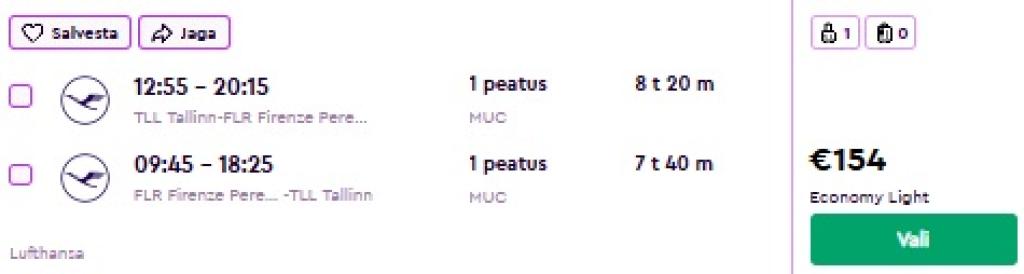 SWISS ja Lufthansa pakuvad hetkel suurepärase hinnaga lennupileteid Toskaanasse. Edasi-tagasi lennupiletid Tallinnast Firenzesse on saadaval alates 154€ eest. Lendudel on mõlemal suunal üks ümberistumine Zürichis, Frankfurdis või Münchenis.