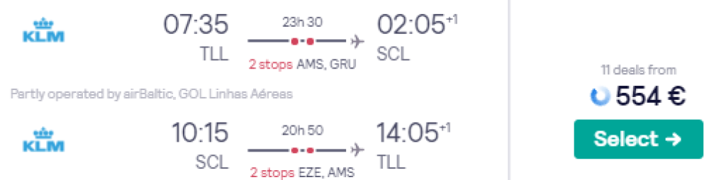 KLM/Air France koostöös partnerlennufirmadega pakuvad hetkel väga hea hinnaga lennupileteid Tallinnast Tšiilisse. Edasi-tagasi lennupiletid Tšiili pealinna Santiagosse on saadaval alates 554€ eest ning soodsa hinnaga lennupileteid leiab alates märtsist kuni juuni lõpuni ja septembris. Lennupiletite ostmiseks kliki allolevatel näidiskuupäevadel.