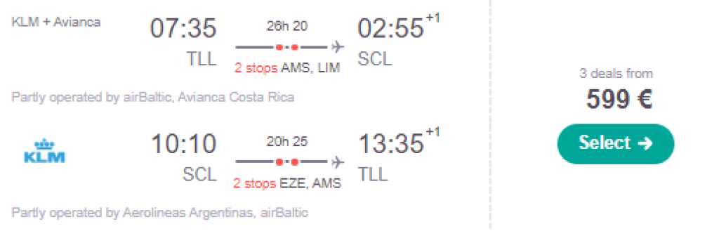 KLM/AF pakuvad hetkel väga hea hinnaga lennupileteid Tallinnast Tšiilisse. Edasi-tagasi lennupiletid Santiagosse on saadaval alates 599€ eest ning saadaval on soodsaid lennukuupäevi veebruarist juulini. Lennupiletiteni jõudmiseks kliki allolevatel näidiskuupäevadel.