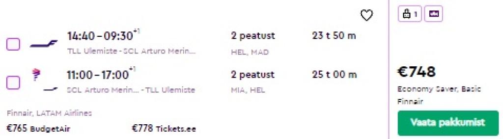 Finnair koostöös American Airlinesi, Iberia ja LATAMiga pakuvad hetkel hea hinnaga lennupileteid Tallinnast Tšiilisse. Edasi-tagasi lennupiletid Tallinnast pealinna Santiago de Chilesse on saadaval alates 748€ eest ning soodsa hinnaga lennupileteid leiab külastamaks Tšiilit jaanuarist märtsini. Lennupiletite hinna sees on ka äraantav pagas. Toome allpool välja vaid mõned näidiskuupäevad, saadavust leiab ka teisteks kuupäevadeks. Parima hinnaga lennupiletid leiad üles läbi Momondo.ee