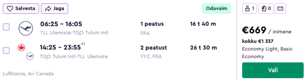 Lufthansa koostöös Air Canadaga pakuvad hetkel hea hinnaga lennupiletid algusega Tallinnast Yucatani poolsaarel asuvasse Tulumisse. Soodsaimad edasi-tagasi lennupiletid Tallinnast on saadaval alates 669€ eest.