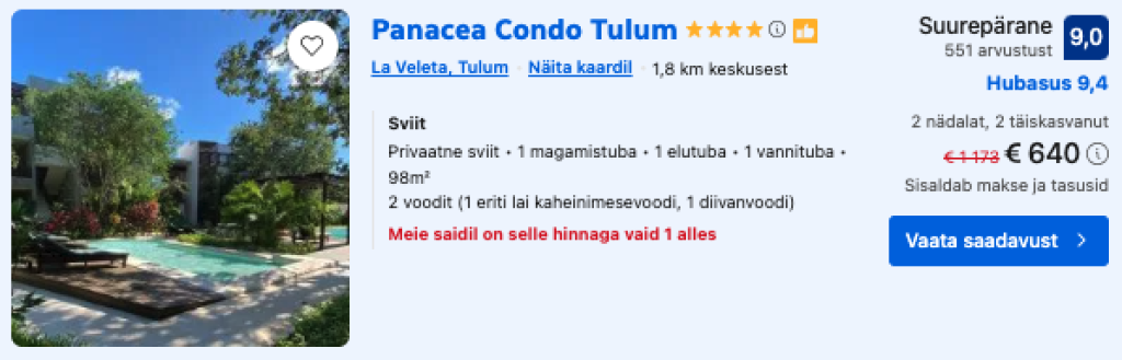 Toome ka välja näite, kuidas saab ise broneerides kahenädalase reisi Mehhikosse kätte vaid 989€ eest (reisides kahekesi). Hinnas sisalduvad Lufthansa lennupiletid Tallinnast ning sviit suurepäraste reitingutega 4* hotellis Tulumis (14 ööd).