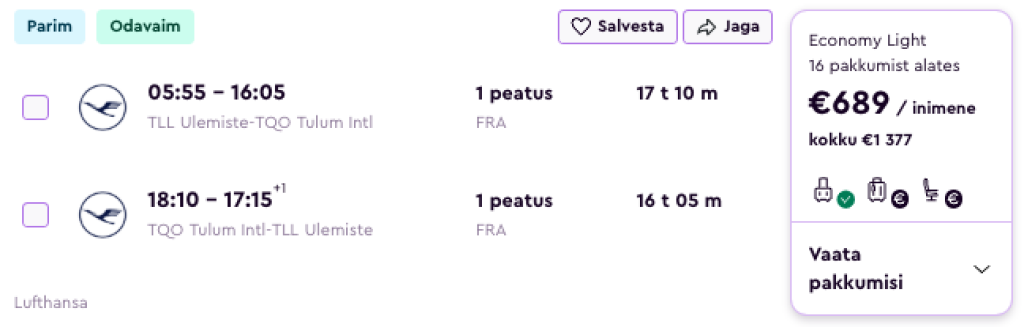 Lufthansa pakub hetkel hea hinnaga lennupiletid algusega Tallinnast Yucatani poolsaarel asuvasse Tulumisse. Ühe kiire ümberistumisega lennupiletid Tallinnast on saadaval alates 689€ eest.