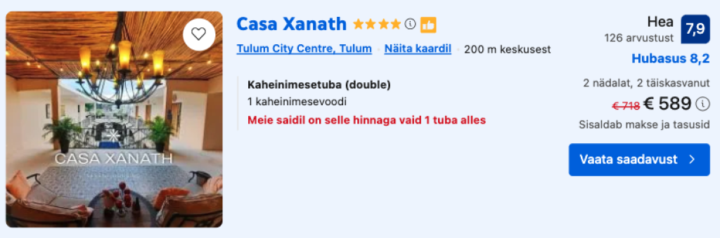Kui otsid soodsa hinnaga majutust Tulumis või mujal Mehhikos, siis soovitame parima ülevaate ja hinna saamiseks kasutada hotellihindade võrdlusportaali Booking.com