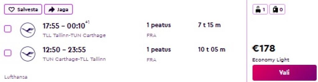 Lufthansa pakub hetkel väga hea hinnaga lennupileteid Tuneesiasse. Edasi-tagasi lennupiletid Tallinnast Tunisesse on saadaval alates 178€ eest. Lendudel on mõlemal suunal üks ümberistumine.