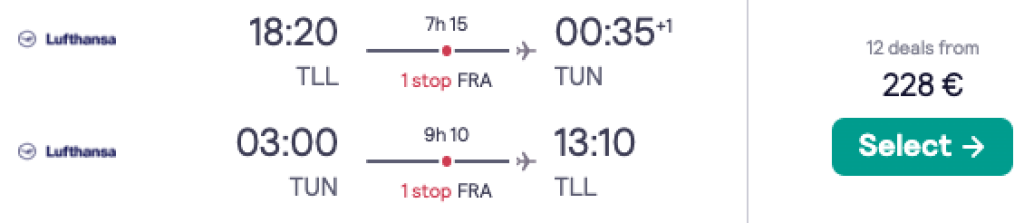 Lufthansa pakub hetkel väga hea hinnaga lennupileteid Vahemere rannikule, Tuneesiasse. Edasi-tagasi lennupiletid Tallinnast pealinna Tunisesse on saadaval alates 228€ eest ning hea hinnaga lennupileteid leiab talveks ja kevadeks. Lennud on mõlemal suunal ühe kiire ümberistumisega Frankfurdis. Parima hinnaga lennupiletid leiad üles läbi Skyscanneri, kui aga soovid osta piletid otse lennufirmalt hinnaga alates 237€, siis mine Lufthansa.com ning sisesta soovitud kuupäevad otsingusse.