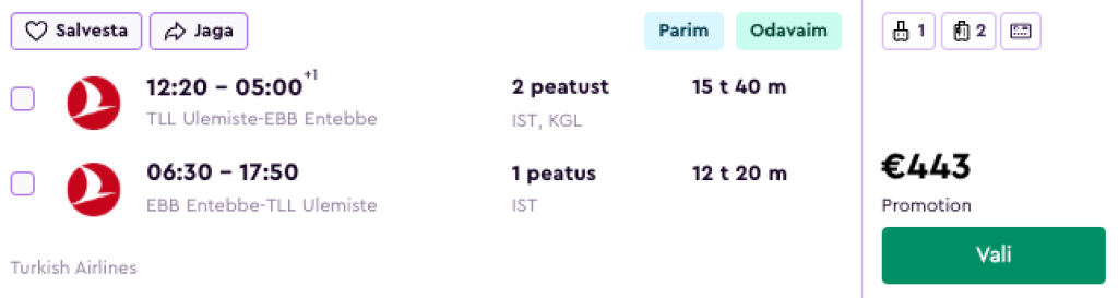 Turkish Airlines pakub hetkel soodsa hinnaga lennupileteid sügiseks ja talveks Ugandasse. Edasi-tagasi lennupiletid Tallinnast Entebbess on saadaval alates 443€ eest.
