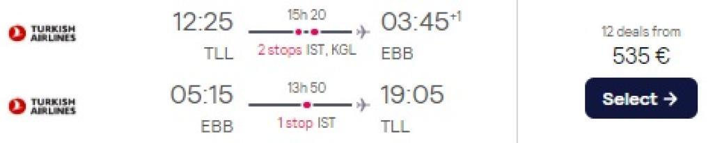 Turkish Airlines pakub hetkel suurepärase hinnaga lennupileteid Ida-Aafrikasse. Ühe ümberistumisega edasi-tagasi lennupiletid Tallinnast Ugandasse on saadaval alates 535€ eest ning hea hinnaga lennupileteid leiab aprillis-mais ning sügiseks. Lennupiletite hinna sees on kaks ühikut äraantavat pagasit ja ka toitlustamine lennukite pardal.