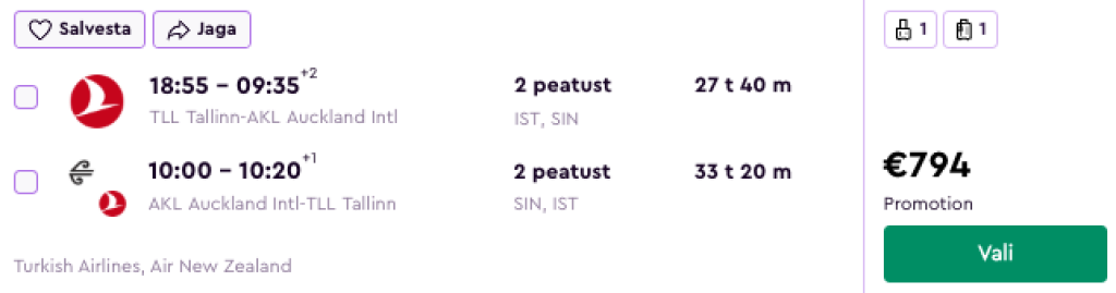 Turkish Airlines pakub hetkel erakordselt soodsa hinnaga lennupileteid Uus-Meremaale Edasi-tagasi lennupiletid Tallinnast Aucklandi on saadaval alates 794€ eest. Lendudel on mõlemal suunal 2 ümberistumist, Istanbulis ning teine mõnes Aasia linnas (Kuala Lumpur, Singapur, Hong Kong)